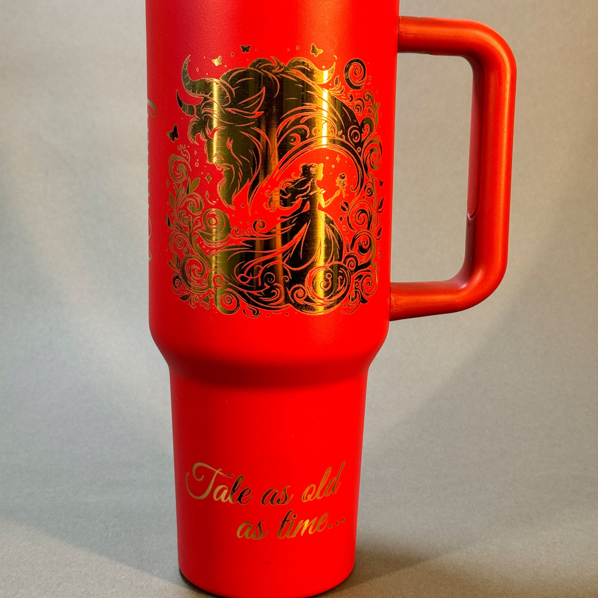 This striking 40oz tumbler brings elegance and enchantment together in one unforgettable design. The bold red powder-coated finish is laser-engraved to reveal shimmering gold artwork beneath, featuring Belle, the Beast, and the iconic enchanted rose in ornate swirling detail. The metallic contrast catches the light beautifully, making this piece as eye-catching as it is practical.