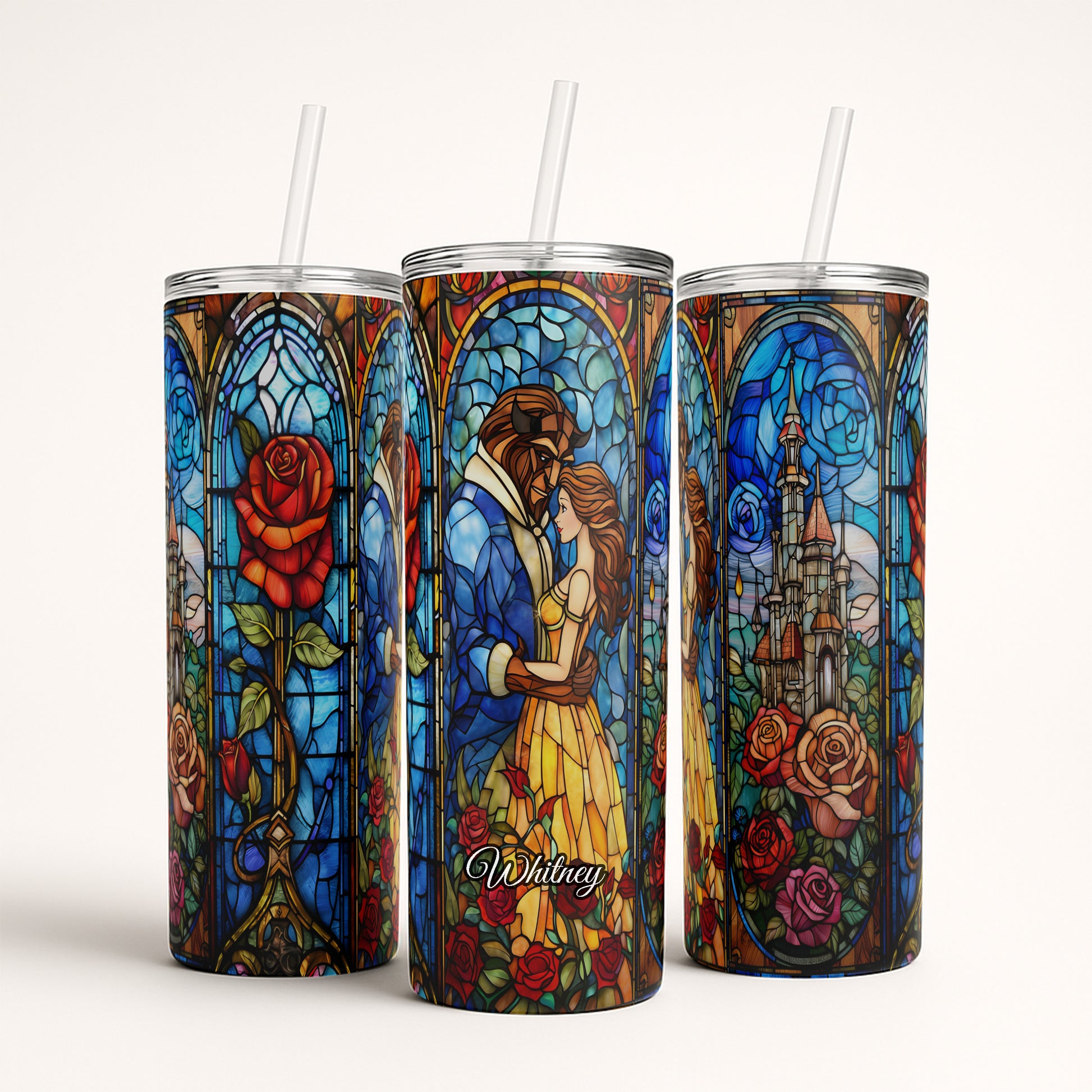 Bring the magic of a tale as old as time into your everyday life with this stunning Beauty and the Beast inspired tumbler. Featuring a vibrant stained-glass design wrapped around the cup, this piece captures the iconic enchanted rose, the castle, and Belle & Beast in their timeless dance.