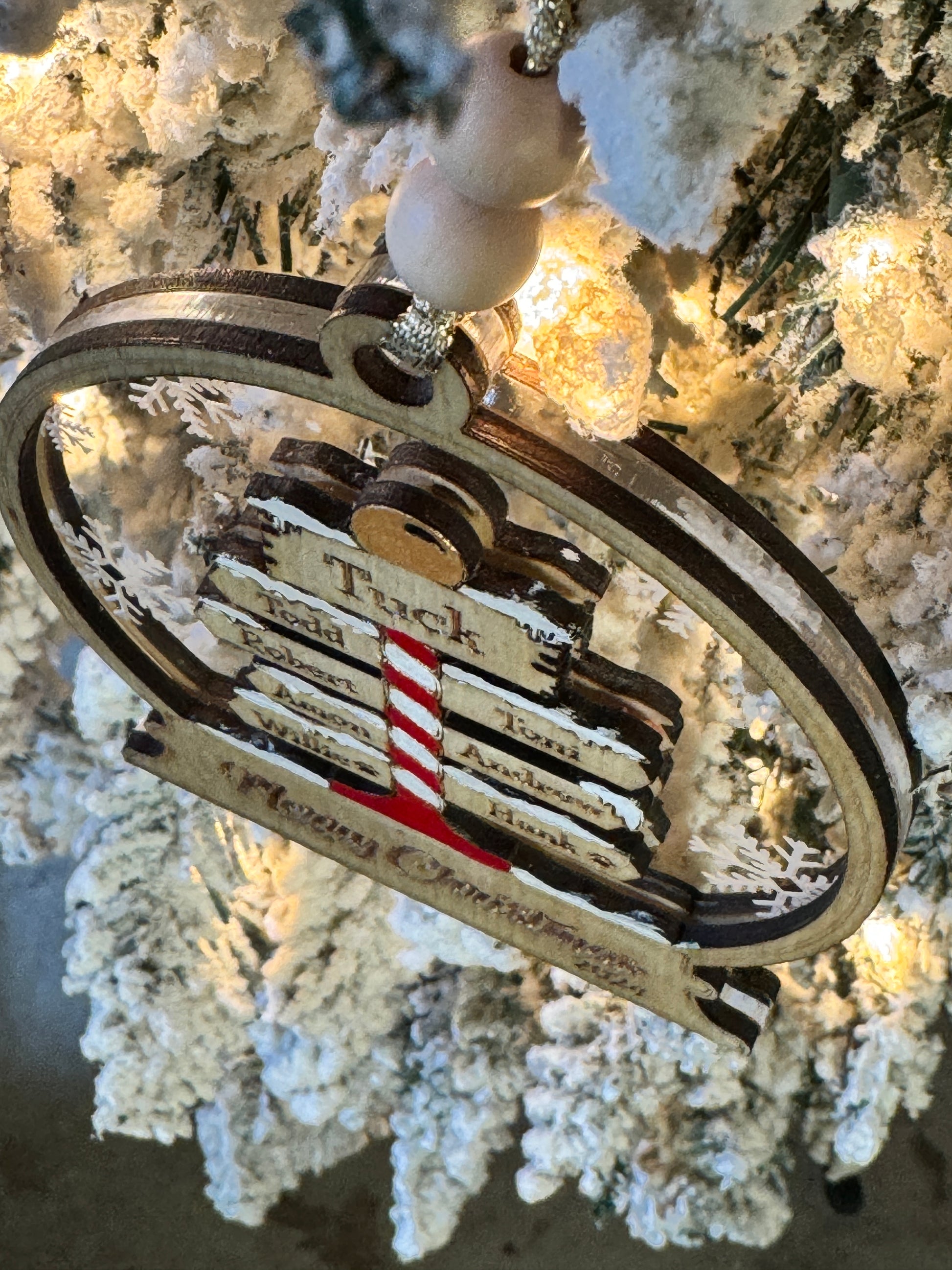 Celebrate your crew with a personalized ornament straight from the North Pole 🎁 This handcrafted design features a festive striped signpost set in a snow globe-style frame, complete with snowflake-kissed clear acrylic and a beautiful Baltic birch wood base.