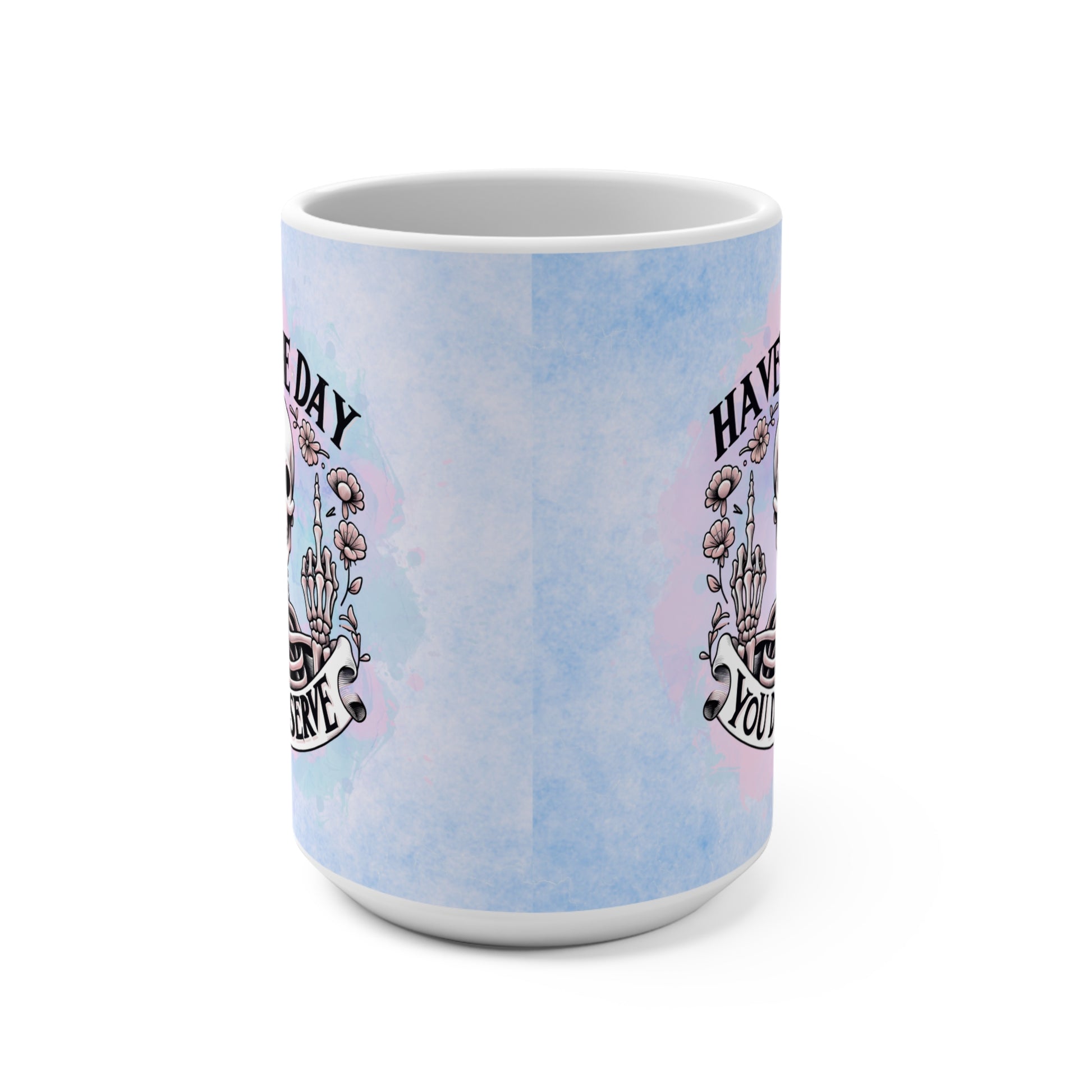 This pastel-hued mug features a delightfully deadpan skeleton dishing out double birds with a grin that says, “I meant what I said.” Perfect for coworkers, frenemies, or just your morning mirror pep talk. 😈