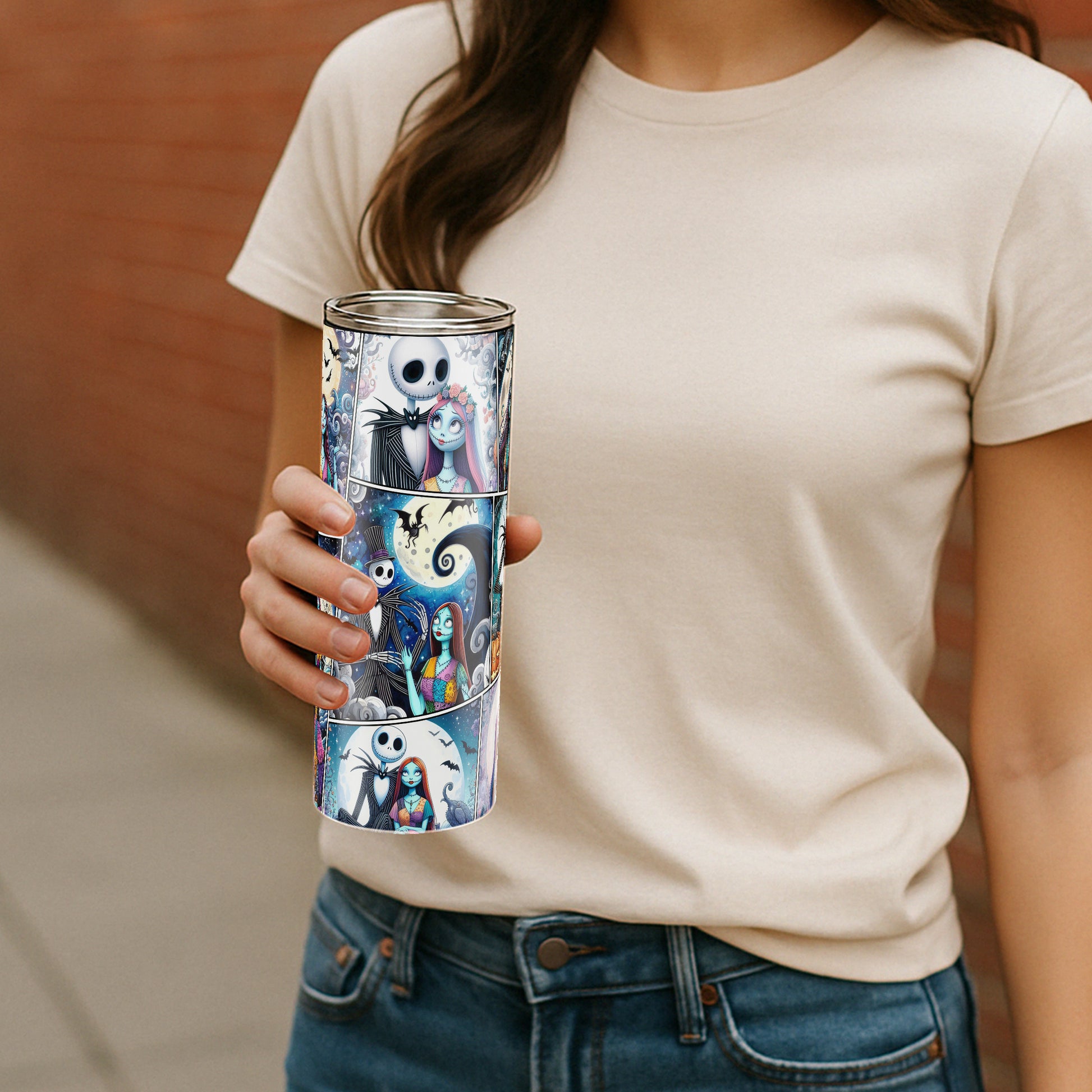Celebrate an iconic gothic romance with this hauntingly beautiful tumbler featuring Jack and Sally surrounded by moonlit skies, swirling designs, and whimsical details. Each panel captures their love story in stunning artwork that feels straight out of a fairytale with a spooky twist.