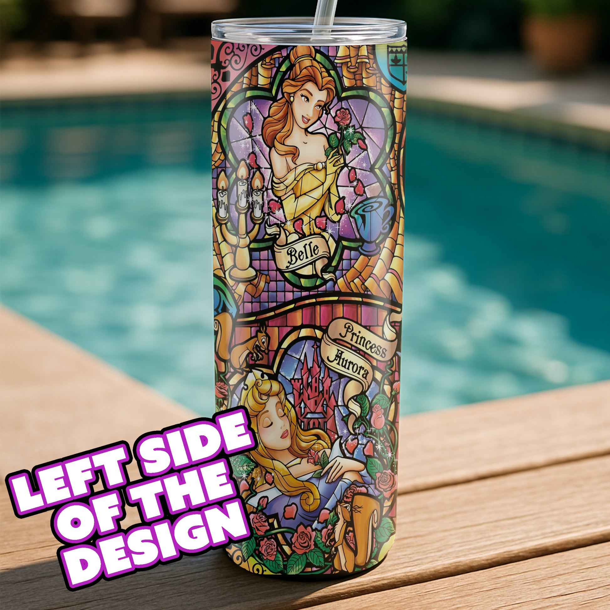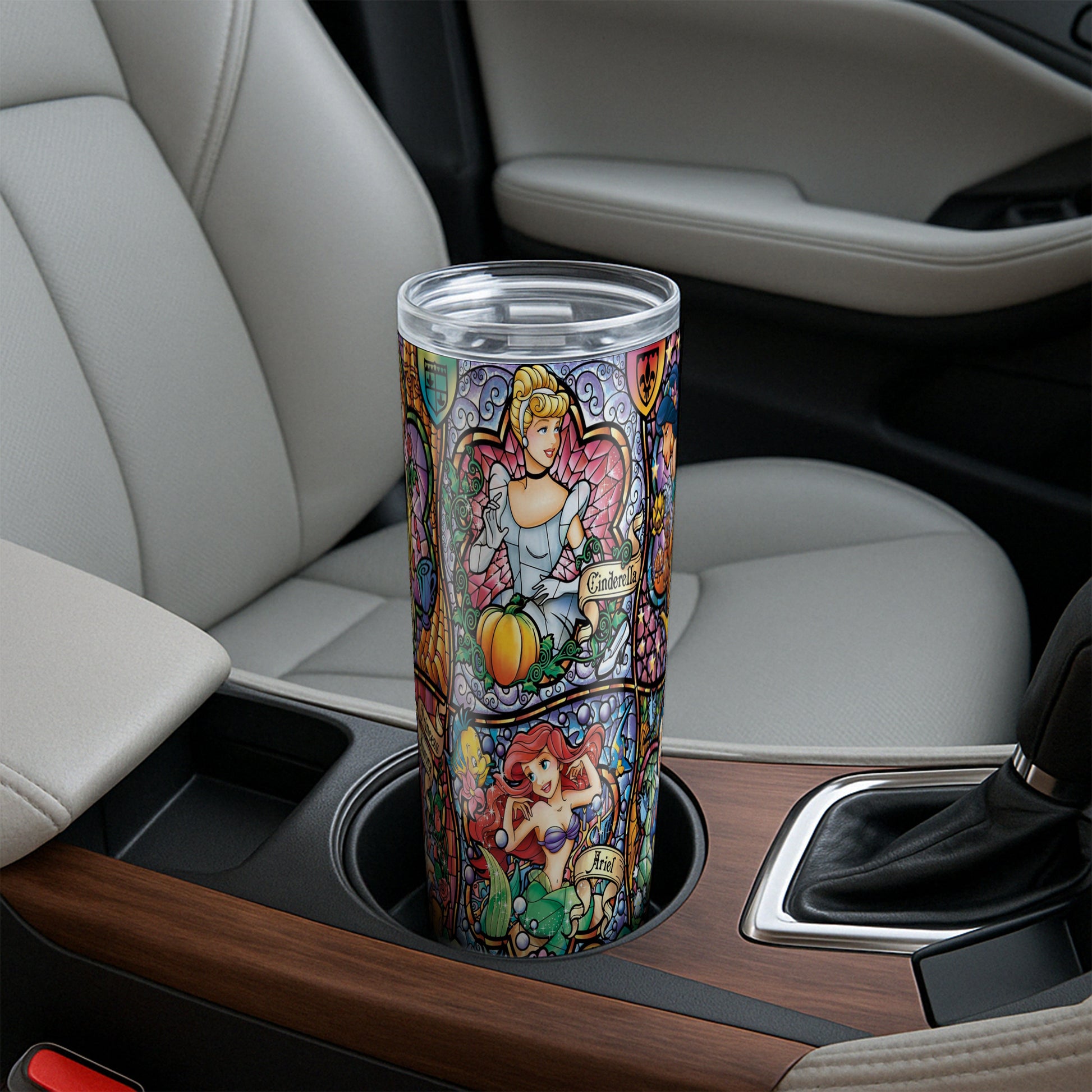 Sip in royal style with this enchanting tumbler featuring your favorite Disney Princesses in a breathtaking stained-glass design. From Belle, Cinderella, Ariel, Aurora, Jasmine, and Snow White, each panel is bursting with color and detail, making this tumbler a magical must-have for every Disney fan.