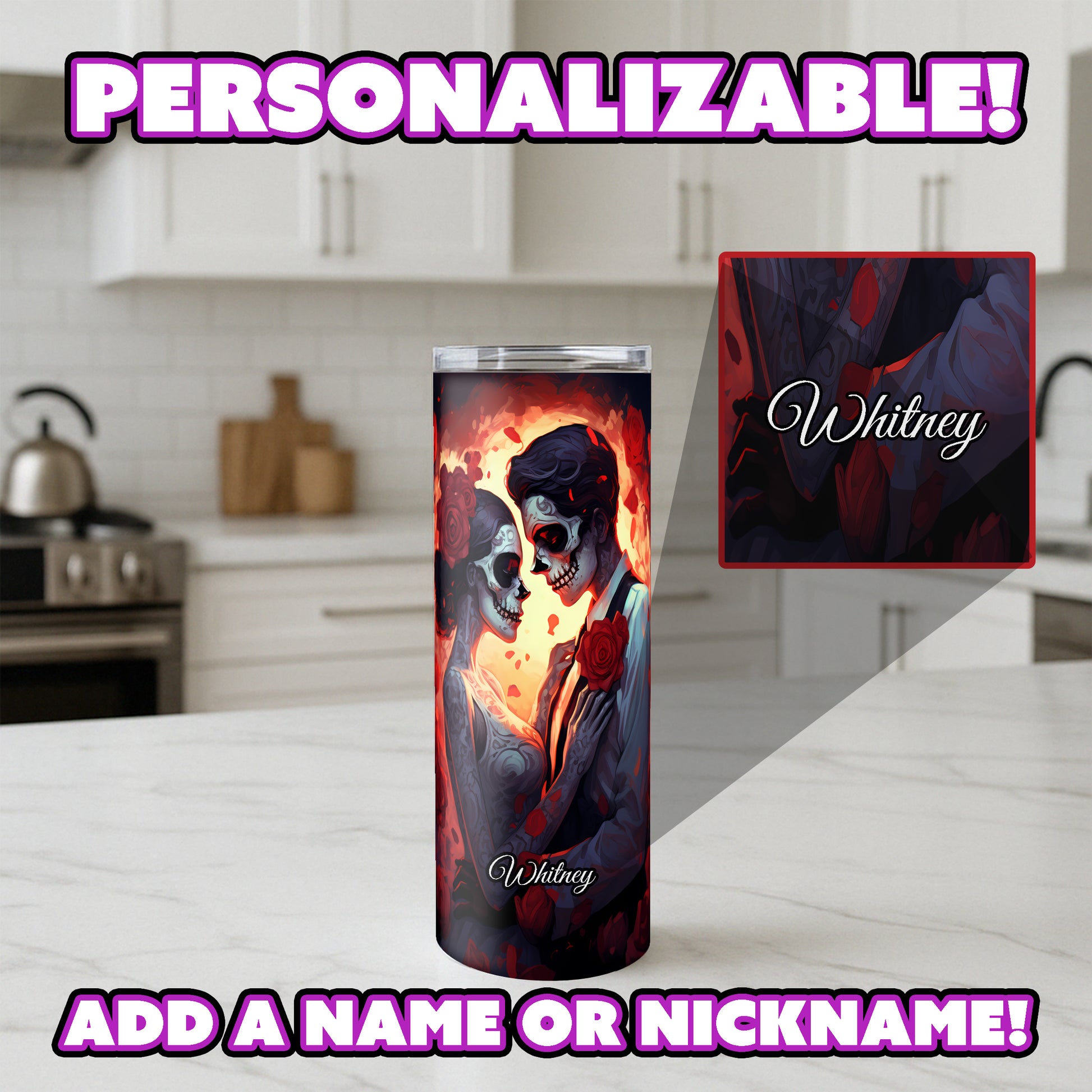 Wrapped in deep crimson roses and lit by an otherworldly glow, this skeletal bride and groom share an eternal embrace. A gothic celebration of passion that endures beyond life and death.