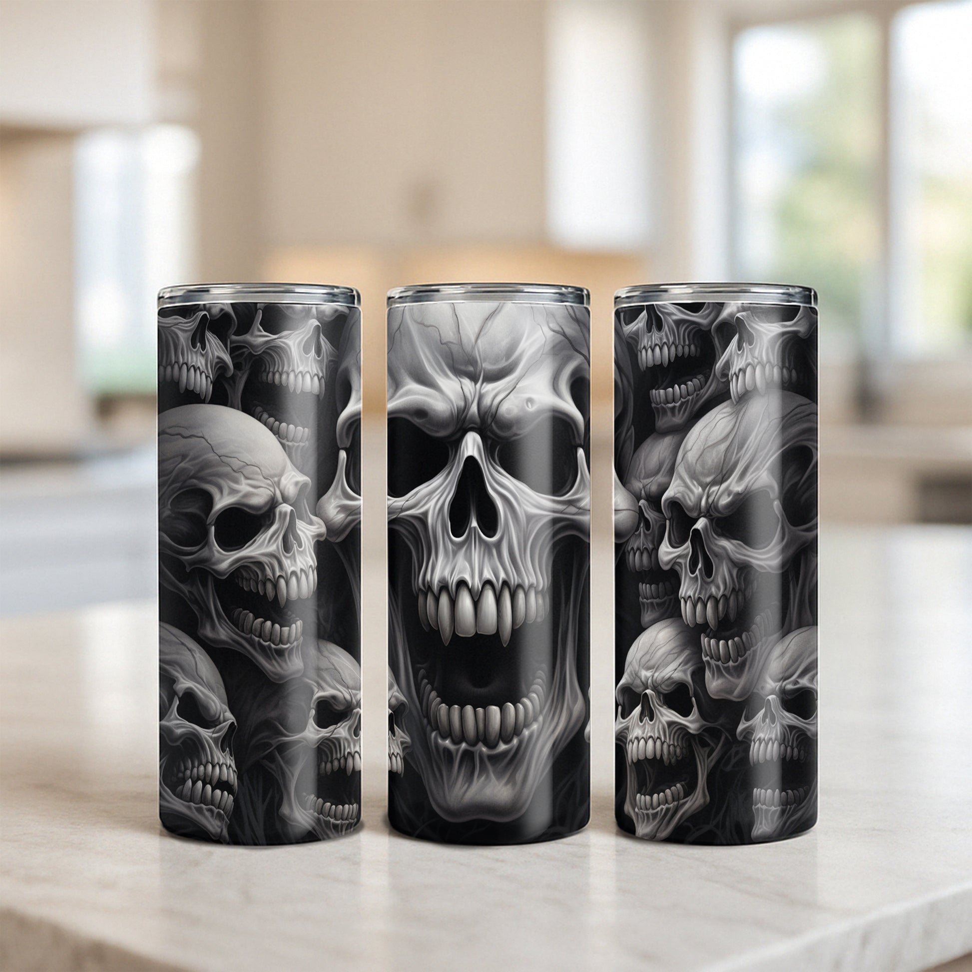 A chilling blend of vampiric hunger and skeletal dread. This high-contrast design features razor-sharp fangs, deathly grins, and hauntingly pale bone—perfect for night stalkers and horror fanatics alike. Sip like a creature of the night.