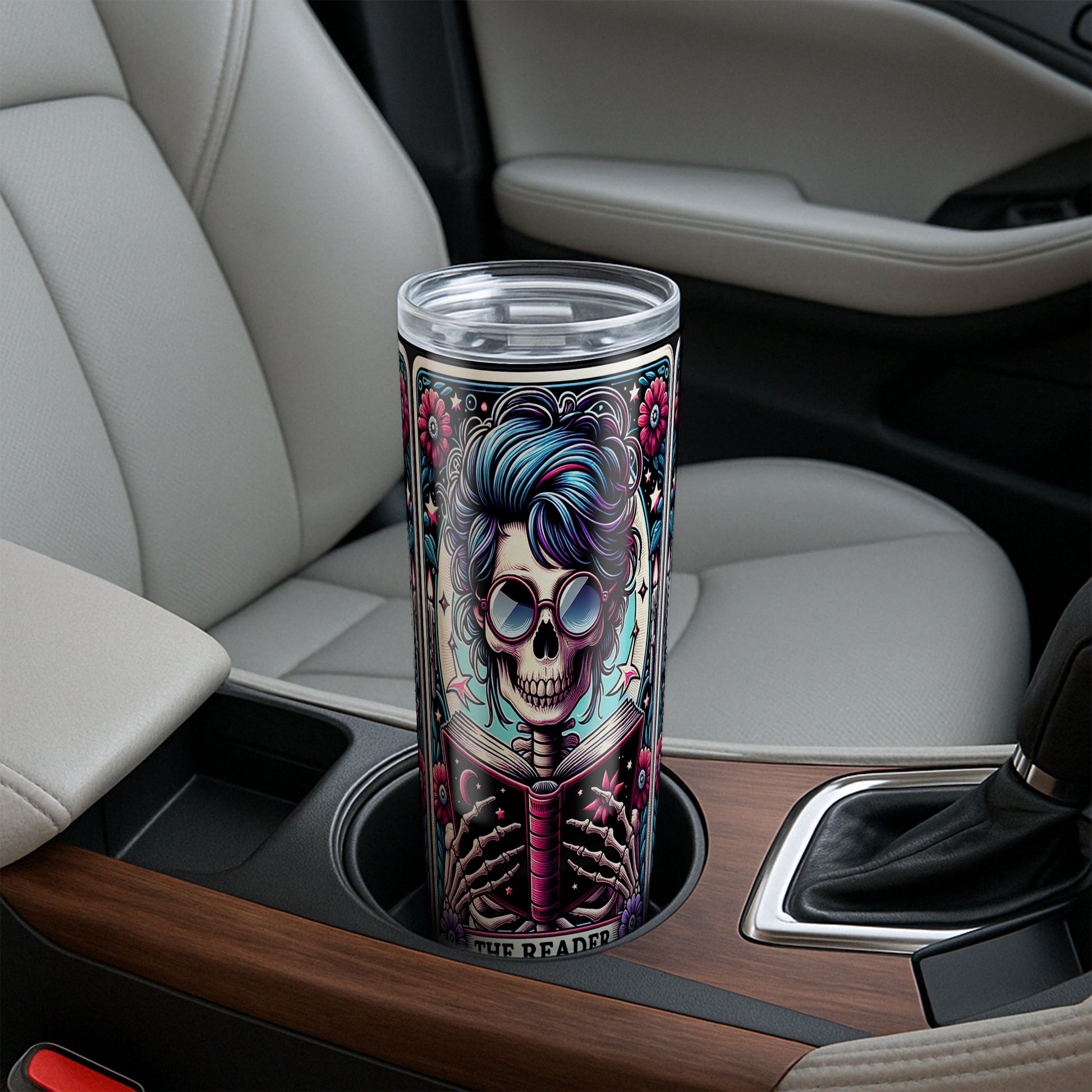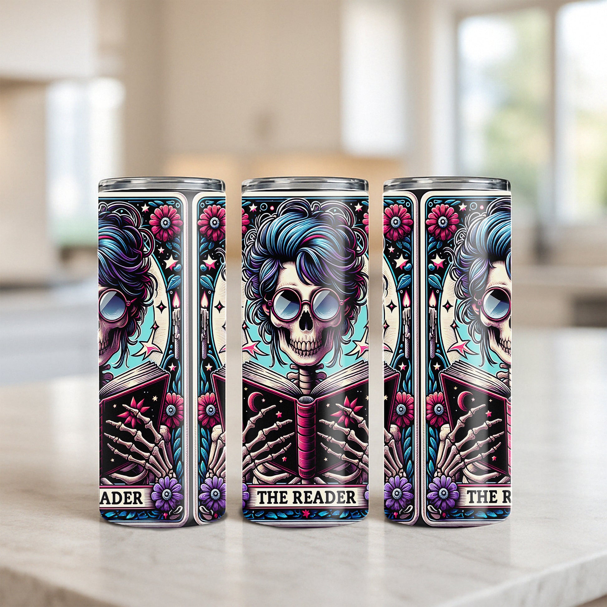 For the ones who’d rather stay up late turning pages than doing literally anything else — The Reader tarot-inspired tumbler is here. Featuring a skeleton with stylish hair and shades, nose deep in a cosmic book surrounded by flowers, stars, and gothic detail, this design is equal parts spooky and sarcastic.