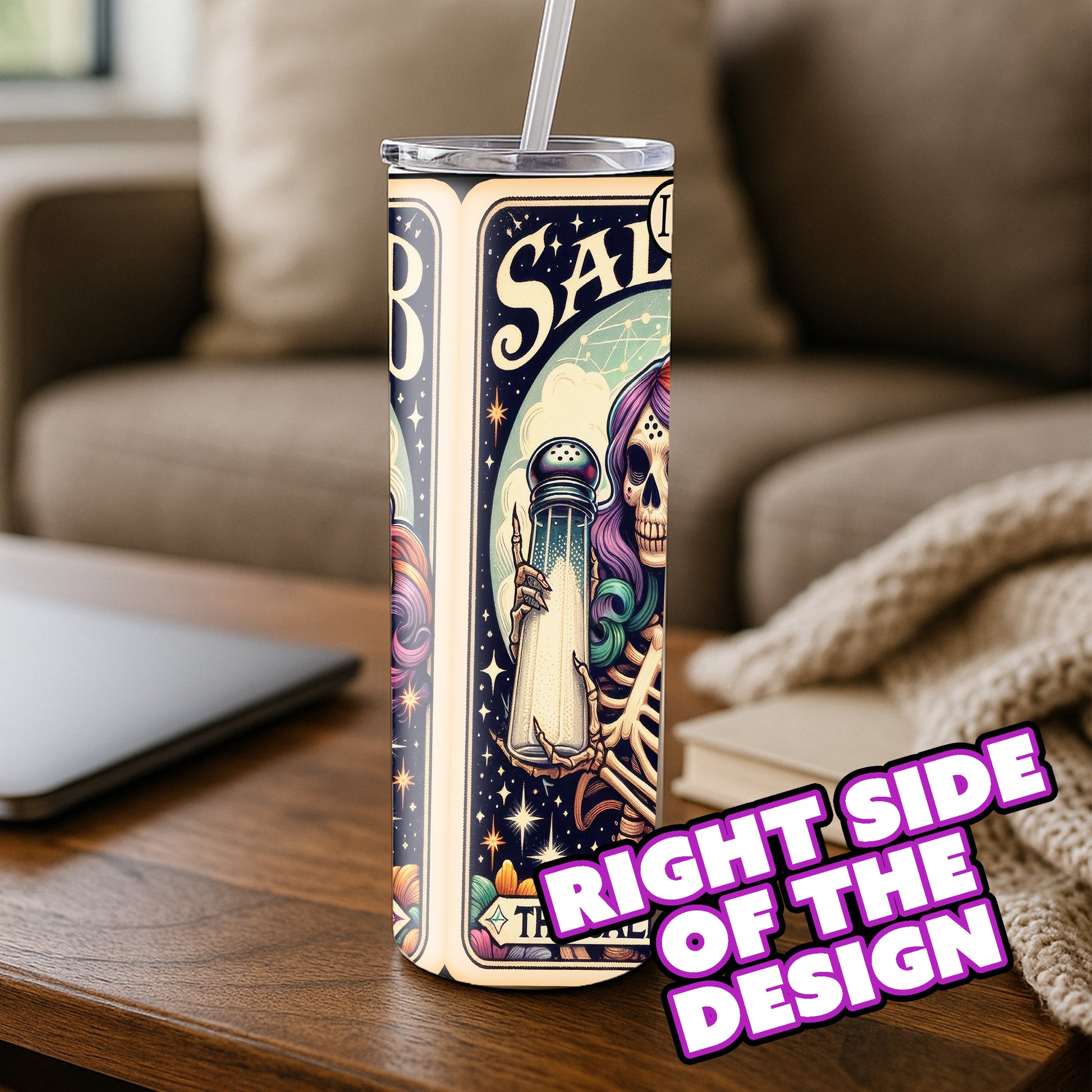 Some days call for sugar. Other days? Pure salt. The Salty Bitch tarot-inspired tumbler features a skeleton with flowing rainbow hair clutching an oversized salt shaker, framed by cosmic details and bold gothic accents. Equal parts sarcastic and hilarious, this design is made for anyone who embraces their salty side with pride.