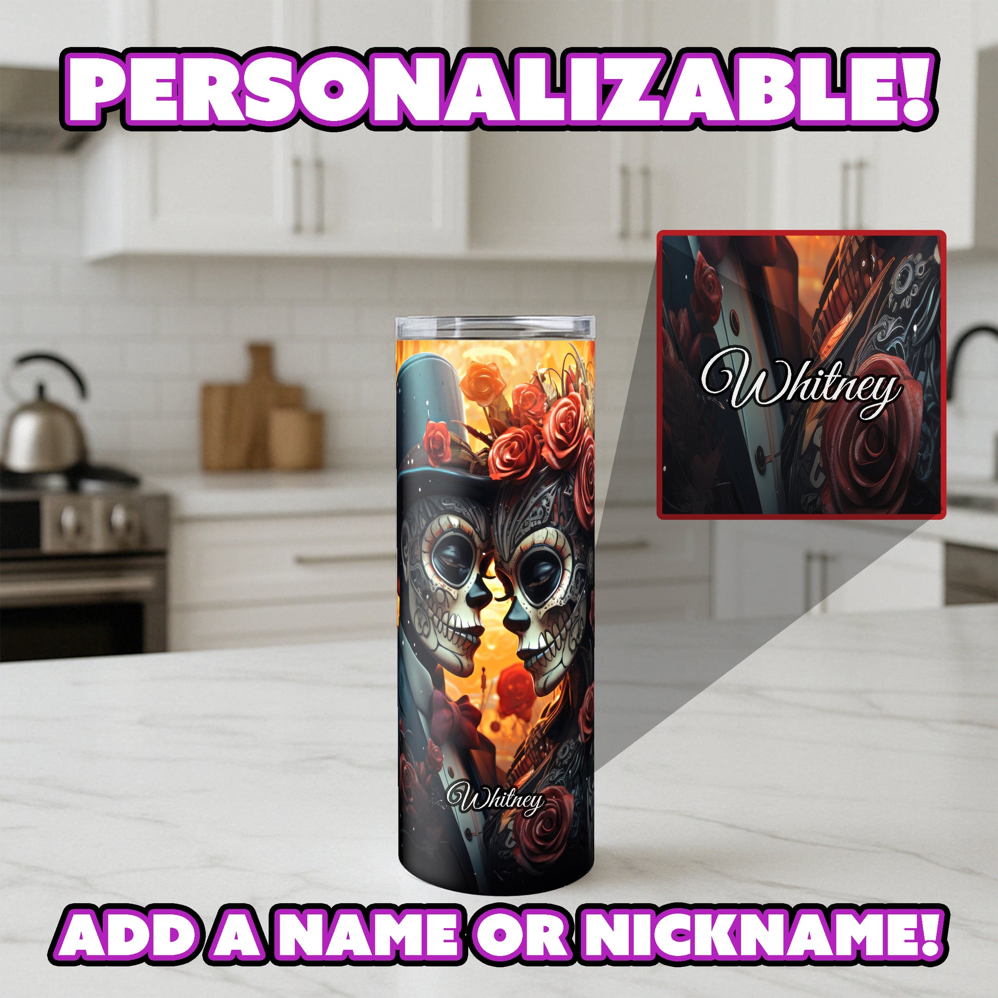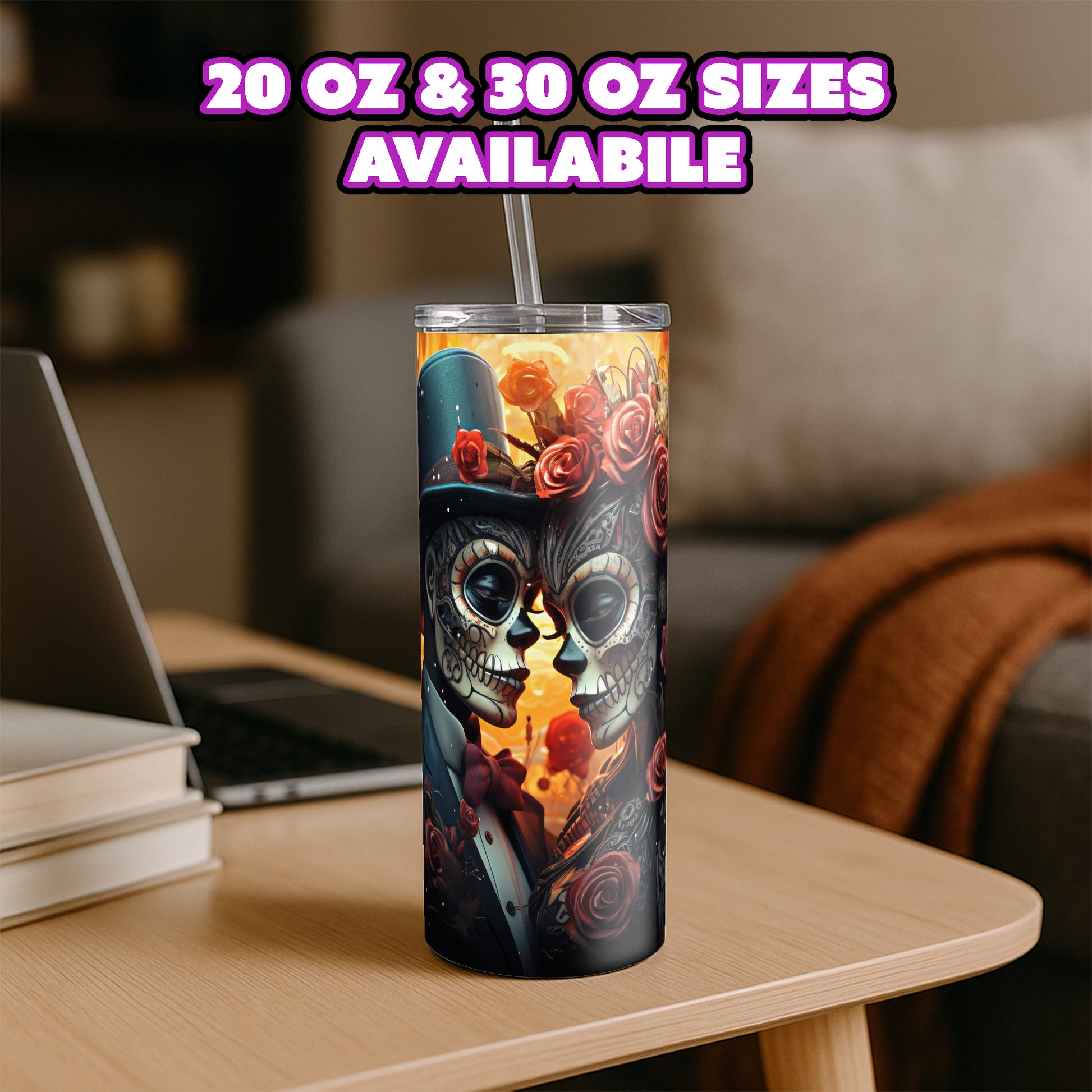 Celebrate eternal love with this Día de los Muertos-inspired design, featuring a skeleton couple adorned with intricate sugar skull makeup and vibrant roses. A romantic tribute to devotion that transcends the grave.