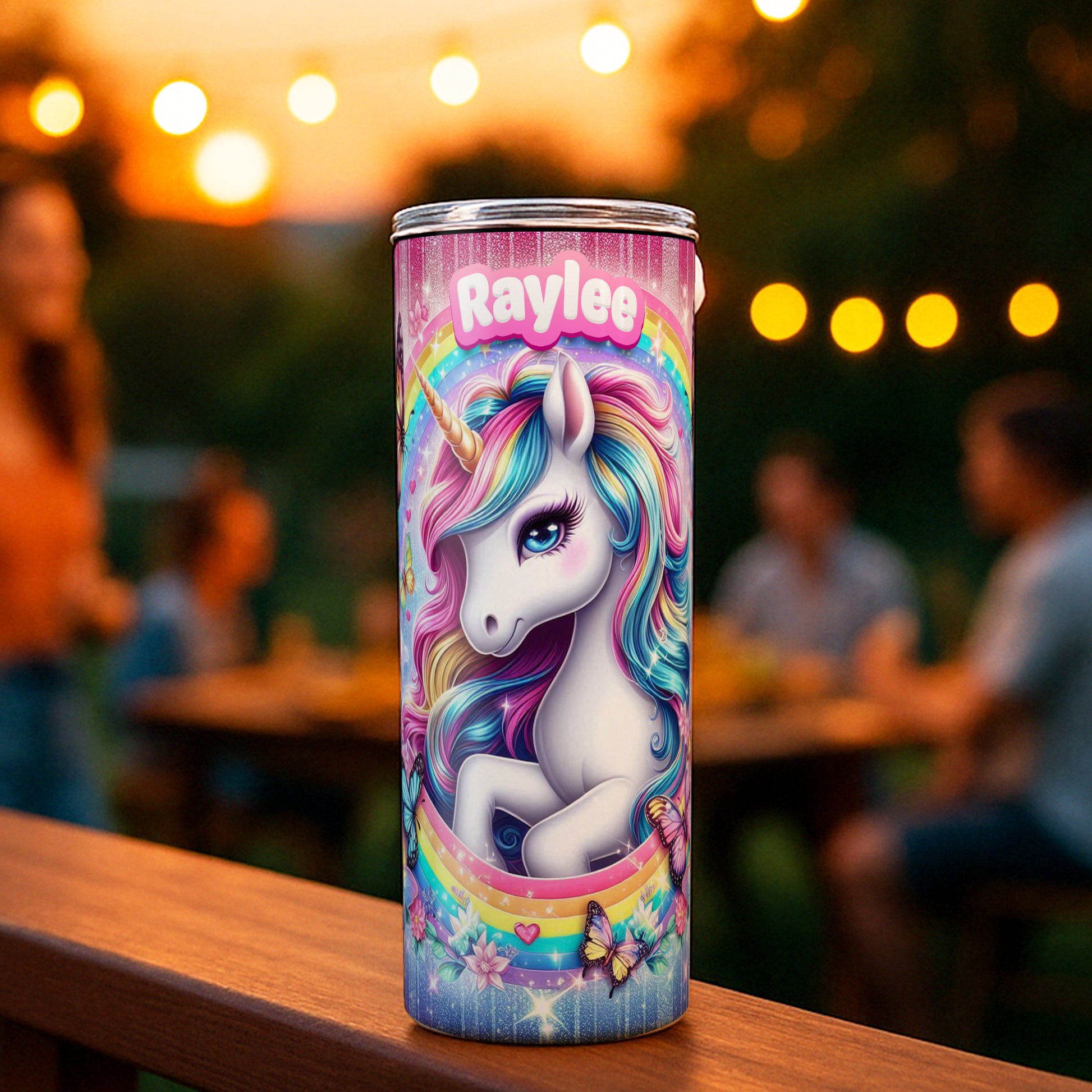 Whimsical, colorful, and full of magic — this skinny tumbler is a dream come true for unicorn lovers of all ages. Featuring a vibrant full-wrap design with butterflies, rainbows, and your child’s name in bold lettering, it’s the perfect companion for school, road trips, or cozy days at home.
