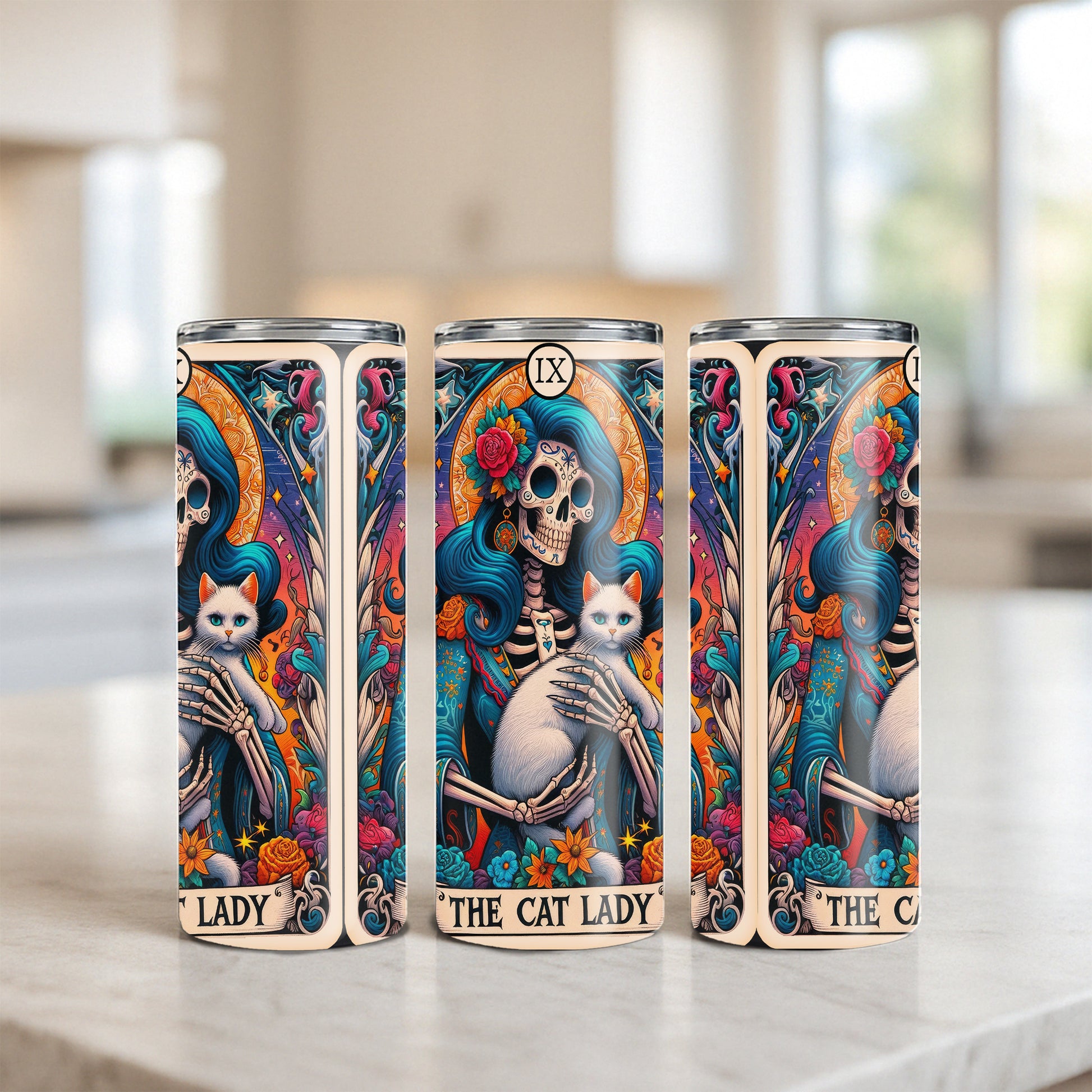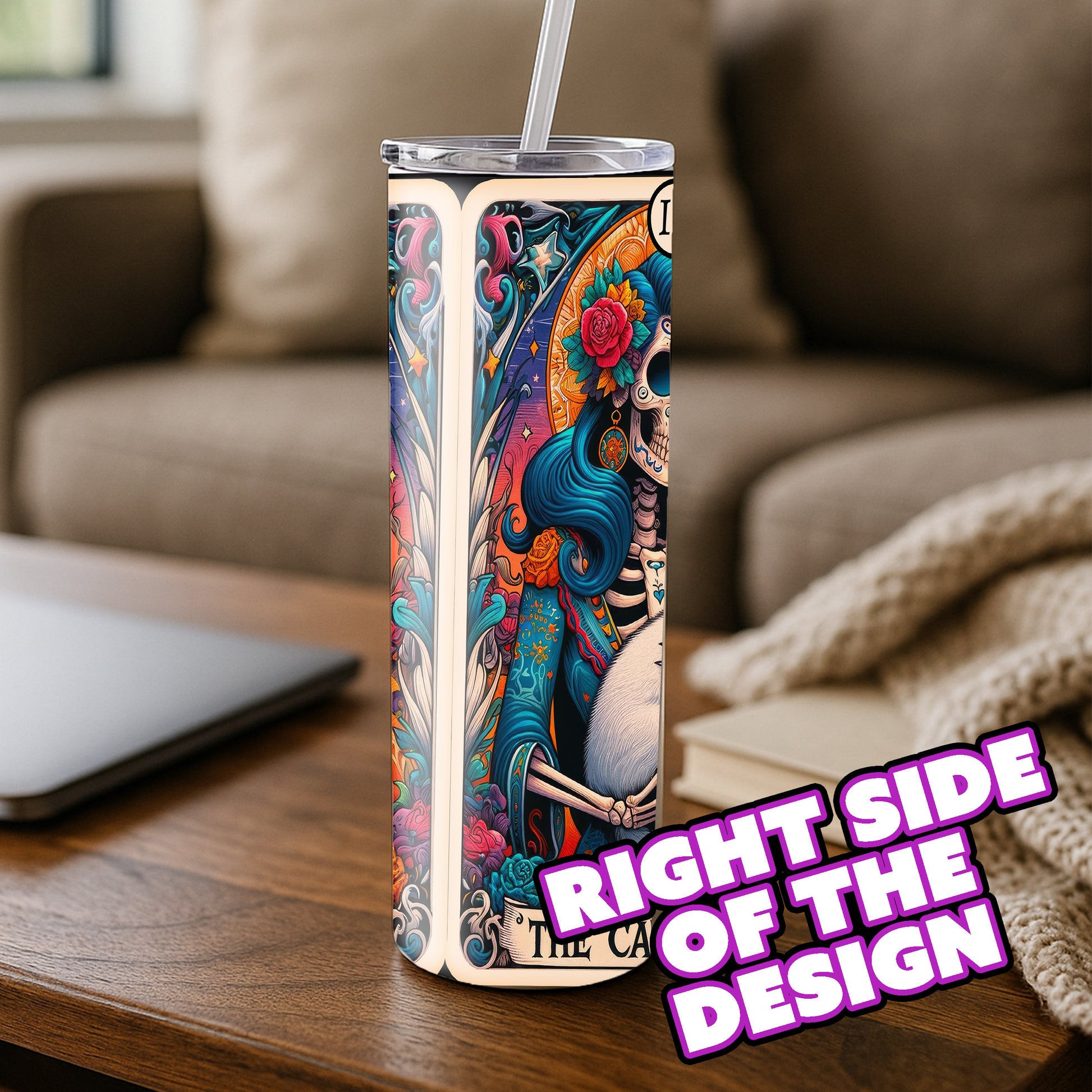Embrace your inner mystic (and your unapologetic love of cats) with this bold tarot-inspired tumbler. The Cat Lady features a skeleton adorned with vibrant florals, holding her feline familiar like the queen she is. Rich colors, gothic linework, and a touch of humor make this design both striking and sarcastically perfect.